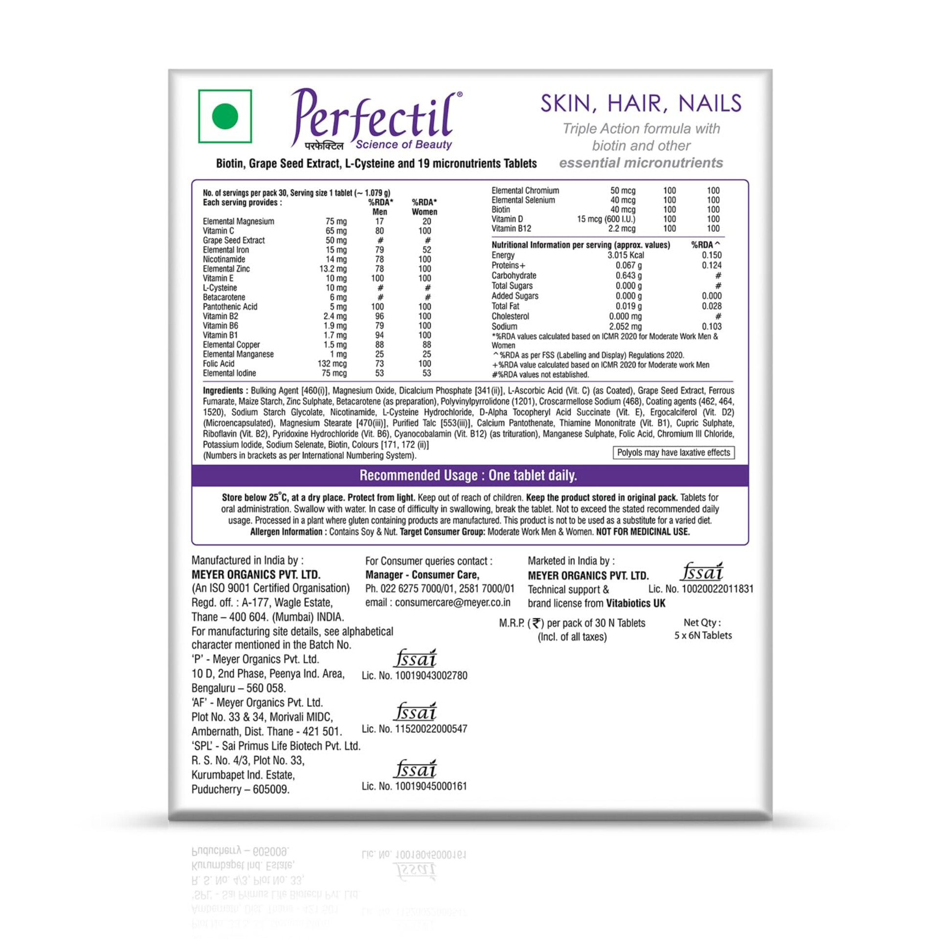 قرص پرفکتیل اورجینال دارای عصـاره هسته انگـور (Grape seed extract)، ویتامین ها و مواد معدنی ضروری می باشد. بدین ترتیب باعث محافظت پوست، مو و ناخن از آسیبهای محیطی و همچنین کمک به ساخت کلاژن و افزایش استحکام پوست می گردد. علاوه بر این، از بین برنده ی تاثیرات منفی هوای سرد زمستان بر روی پوست (شامل خشکی و خطوط ریز) می باشد که موجب پیر شدن آشکار پوست می شود.