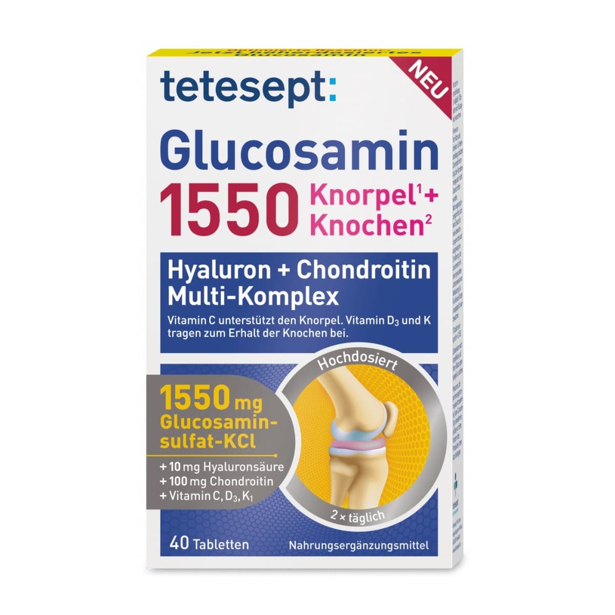 مولتی کمپلکس غضروف و استخوان Tetesept Glucosamine 1550 حاوی گلوکزامین سولفات-KCl، هیالورونیک اسید، کندرویتین، گلوکزامین، ویتامین D3، ویتامین C ، ویتامین K و روی و مس است که به حفظ استخوان های سالم کمک می کنند.